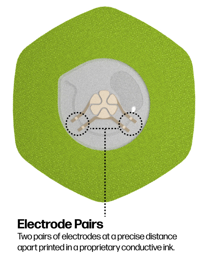 When you apply a Sweat Patch to your bicep, the patch seals off the outside environment, effectively isolating your sweat during a workout. As your intensity picks up and you begin to sweat, the patch begins sensing your fluid losses. The sweat enters the patch through an inlet, travels down the flow path, and then exits the flow path at the opposite end through a small outlet. The sweat’s electrical conductivity is measured through two separate sets of electrodes also located on the back of the patch. Our proprietary machine learning neural network leverages these time series and calculates how long it takes for a particle of sweat to travel between the pairs of electrolytes. Since we know the distance between them, and the time that it takes to get from point A to point B, we can calculate the velocity of a sweat particle. Velocity = Distance ÷ Time. That velocity translates into your personal local sweat rate on the bicep.