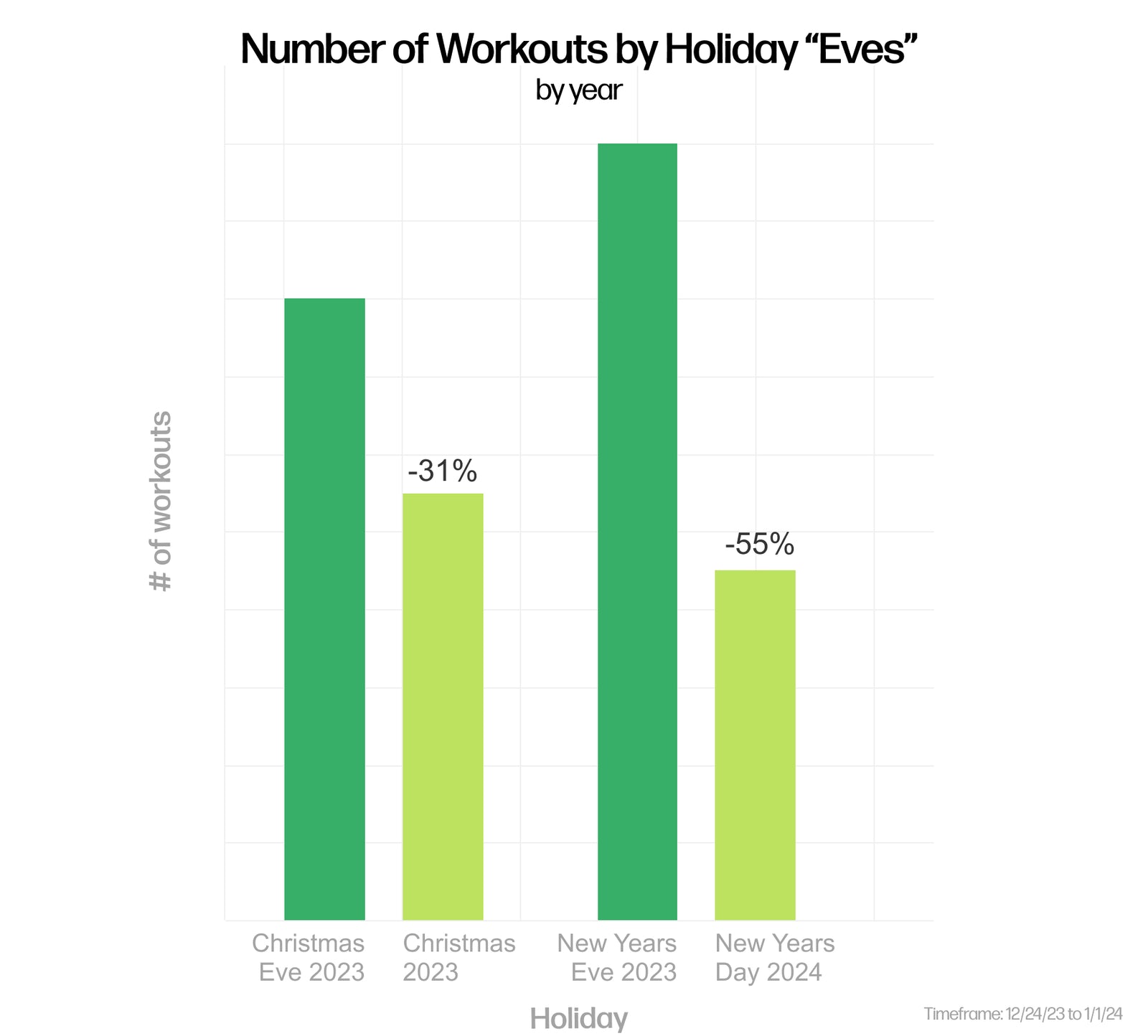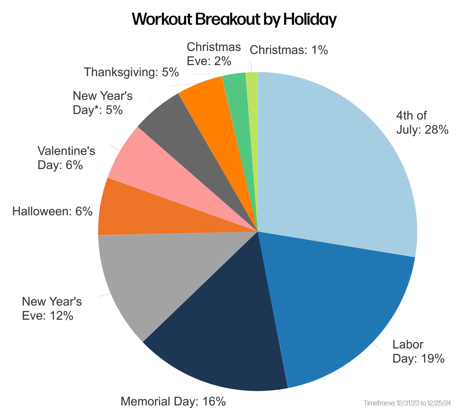Holidays are a time to relax and often athletes find themselves traveling or preparing to host friends and family members. It’s no surprise that we see more workouts on the eve of major holidays. New Year's Eve had more than double the number of workouts than New Year's Day. Similarly, Christmas 2023 had 31% less workouts than Christmas Day. Logging that workout can sometimes give you a personal “hall pass” to enjoy the holiday but for many it is a testament to an athlete’s mental and physical discipline.