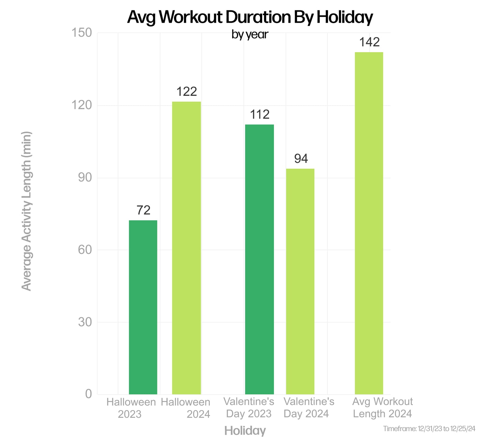 New Year’s Eve marks the longest average holiday workout for Nix users. The average workout length was just over 3 hours at 186.7 minutes. This is approximately 41 minutes, or 28% longer than the average workout within the last 12 months. New Year’s Eve is particularly symbolic for many athletes. It represents a moment to close out the year with purpose and set the tone for the next. Training on this day is often a physical manifestation of the resolutions and goals they plan to chase in the coming year. For some, it’s about finishing the year strong, a final push to reflect their dedication over the past months. For others, it’s a way to stay ahead of the curve—an early start on their January goals while the rest of the world waits for the clock to strike midnight.