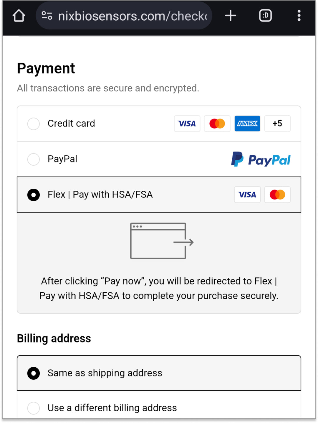 We’ve partnered with Flex to give you the ability to use your Health Savings Account (HSA) or Flexible Spending Account (FSA) for your Nix Biosensors purchases. With Flex, you can save 30-40% by using pre-tax dollars, helping you avoid income tax on your purchase, which lowers your overall cost based on your tax bracket.