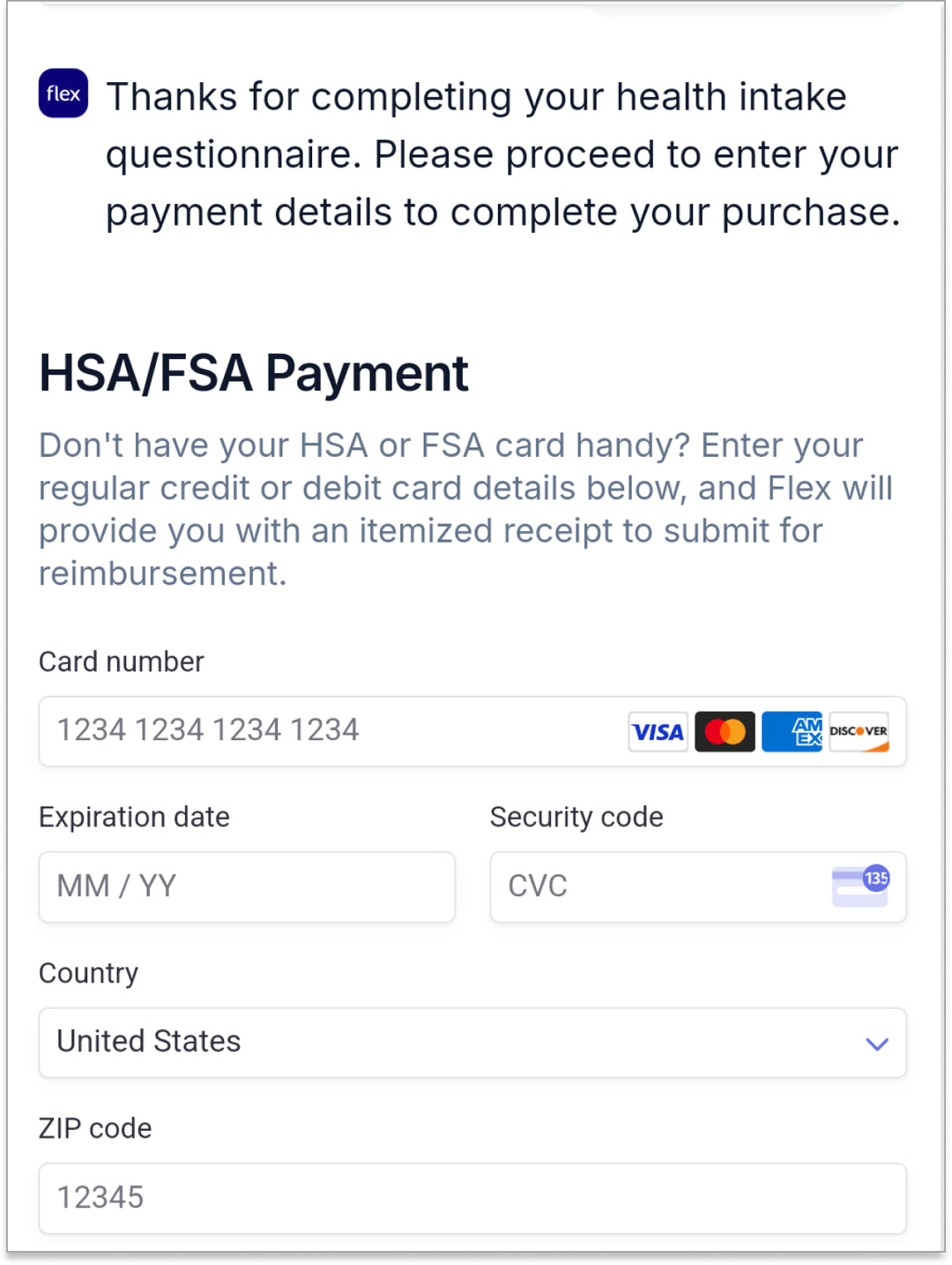 To use your HSA or FSA debit card, add products to your cart as usual. At checkout, select “Flex | Pay with HSA/FSA” as your payment option. During the checkout process you will enter into a chat feature where you will answer a few simple questions about your medical background to secure your Letter of Medical Necessity (LOMN) and utilize your FSA/HSA funds at checkout.