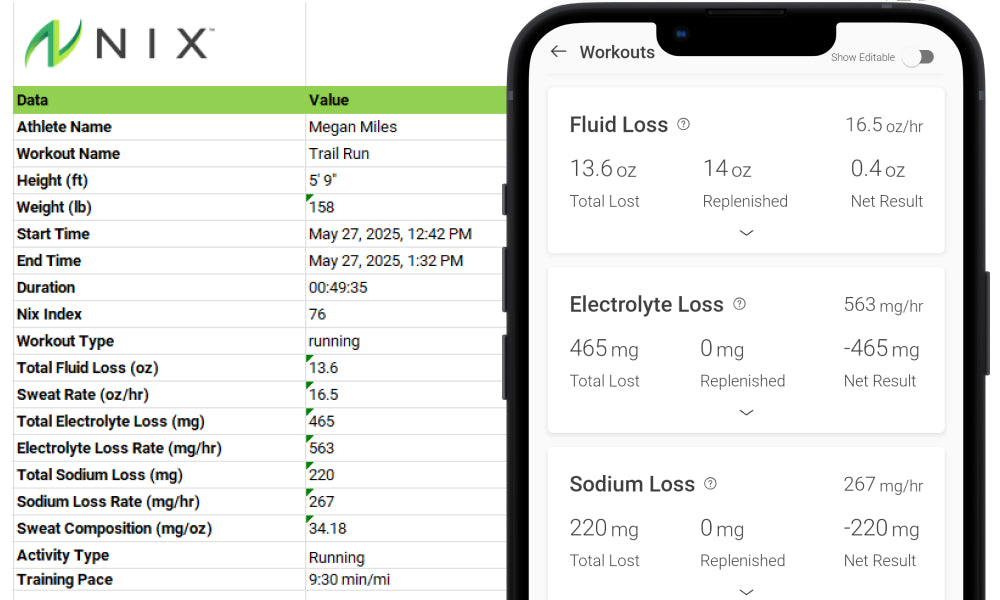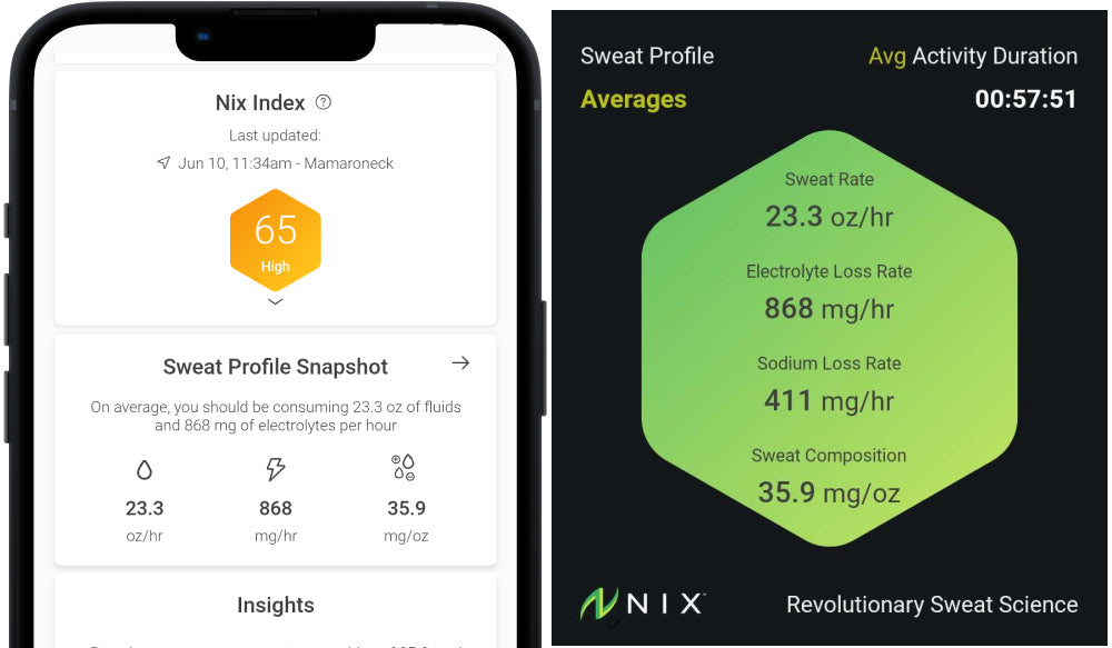 Review your personalized sweat losses, electrolyte losses, sodium losses, and sweat composition. Nix analyzes your sweat moment to moment, not a generic calculation.