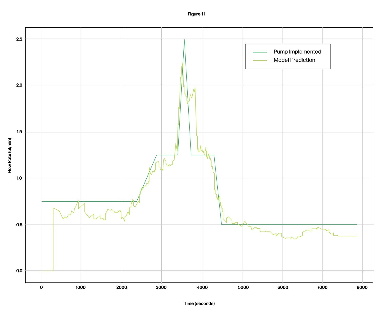 In parallel to calculating electrolyte content via osmolality, Nix’s proprietary algorithms calculate the flow rate of sweat as it passes through the flow path in the patch. As referenced in the Raw Sweat Impedance Measurement section above, Nix’s machine-learning model identifies the ΔT between the two time series of the two pairs of electrodes - Impedance A and Impedance B - in the flow path. This ΔT equals the time delay for sweat to move from the first pair of electrodes (Impedance 1) to the second pair of electrodes (Impedance 2). Given the known distance between the electrodes, the algorithm calculates the flow rate. A blinded, controlled test was performed with an injection pump pushing fluids into the patch at known flow rates. When compared to the algorithm’s calculations, the error rate was 7.8% underprediction, or precision of 93.2% (Figure 11).