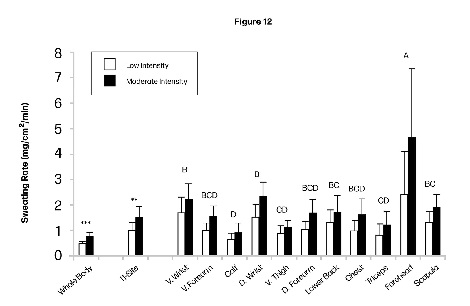 Figure 12. Sweating rate during LOW and MOD intensity trials. n = 11 for all sites except D. Wrist and V. Wrist, where n = 10. D dorsal, V ventral. **p < 0.01, ***p < 0.001, LOW vs. MOD for whole body and 11-site aggregate (paired t tests).