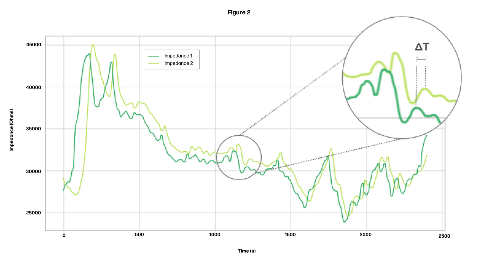 The impedance value of the sweat (i.e. on the y-axis) is ultimately extrapolated to the electrolyte concentration. The time it takes for sweat to travel from the first pair of electrodes to the second pair of electrodes (i.e., on the x-axis) represents the sweat rate on the bicep where the patch was placed. On the timeseries graph, this is represented by the ΔT between the two timeseries.
