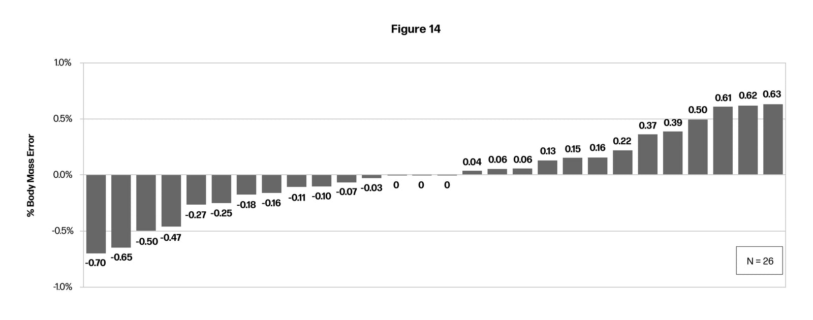An in situ study was conducted with subjects who were blinded to sensor data. Subjects ran for 60 minutes on a treadmill without fluids. Nude body mass was taken before and after activity to measure whole body water losses. Our sensor and proprietary algorithms reported Cumulative Fluid Losses with a MAPE of 17.2 (accuracy of 82.8%), compared to the gold standard, change in nude body mass. Figure 14 shows the error profile for each subject as a percent of body mass. Note that the most inaccurate cases were still within ±1% body mass change, well below the scientifically accepted threshold at which performance impairment would be onset, of 2%.