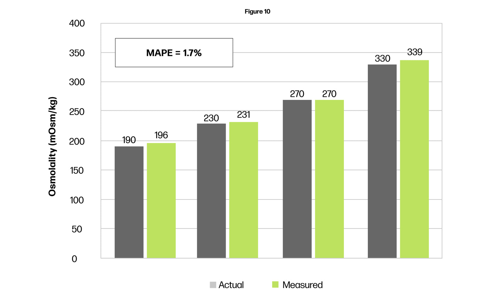 To further validate this algorithm, a blinded osmolality test was conducted with control solutions of known osmolality, and raw impedance values were recorded. Our sensor and algorithms converted the raw data to temperature-corrected osmolality for a measured value as compared to actual osmolality value (Figure 9). The actual and predicted values produce a mean absolute percent error (MAPE) of 1.7% (Figure 10), or precision of 98.3%. Osmolality is then converted to milligrams of electrolytes (in aggregate) for reporting to the user through the app.