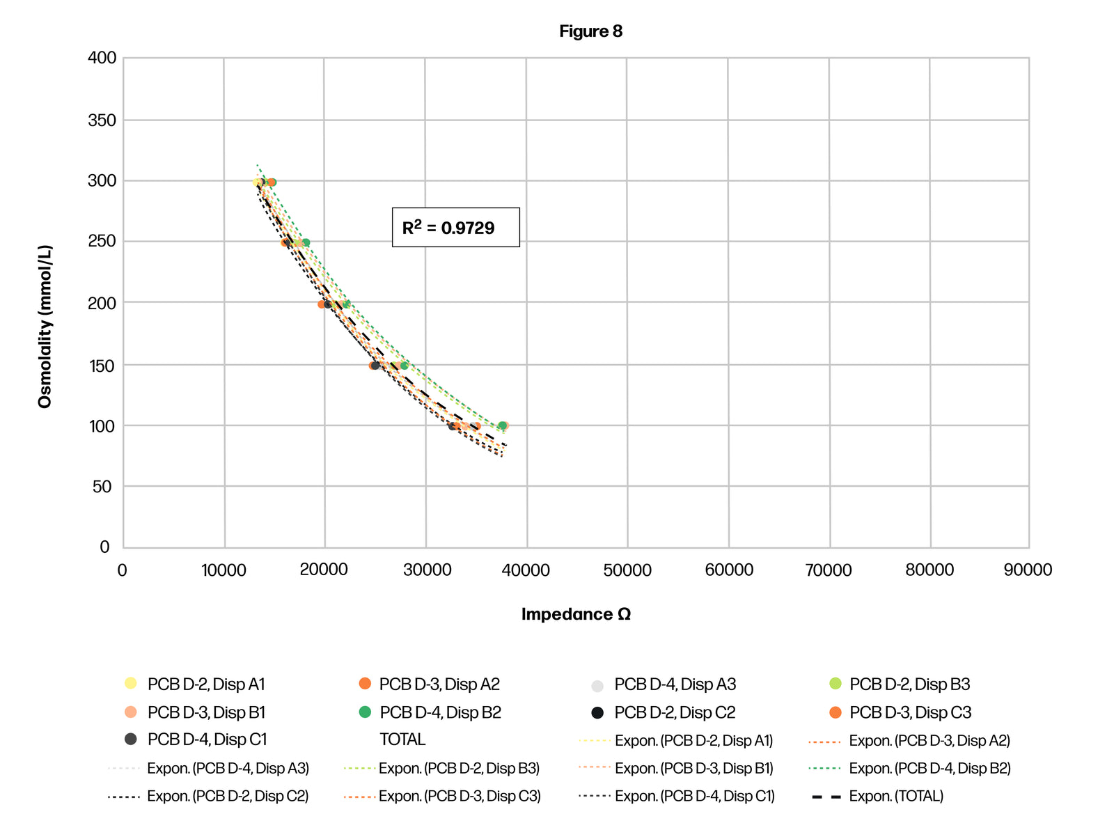 Once temperature-corrected, the normalized impedance values are extrapolated to the osmolality of the sweat. To establish this algorithm, control solutions of known osmolality (i.e., electrolyte content) were pumped through the sensor with an injection pump on the benchtop using several different sensor units, and several different disposable units. The equation of this curve is the algorithm to convert our temp-adjusted impedance to osmolality (Figure 8. Note: The proprietary equation has been redacted.). The best-fit curves show precision of 97.3%.