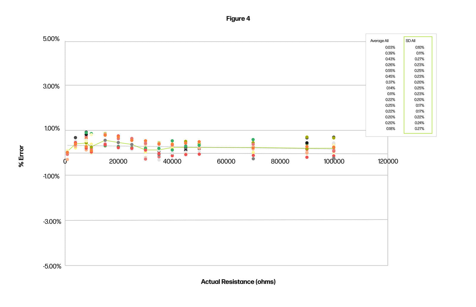 To validate that our sensor accurately measures electrical impedance, we tested our sensor’s impedance measurements against fixed resistors at 13 different resistance levels on the benchtop. The comparison of our sensor’s measured value to the fixed resistor produced a perfect R2 = 1 (Figure 3). Variations across several sensor units resulted in standard deviations of 0.1% to 0.27%; or precision of 99.7% to 99.9% (Figure 4).