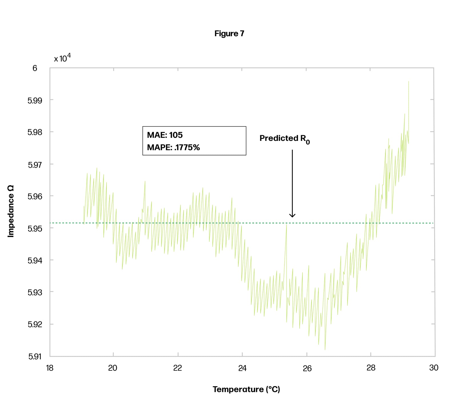 Impedance is a temperature sensitive metric which must be normalized before further algorithmic processing. To establish this temperature correction algorithm, a temperature sweep was performed in an environmental chamber from 10 60⁰C (50-140⁰F) while the sensor was running with a control solution of known electrolyte content. Impedance values were recorded (Figure 5. The equation that describes the best fit line is the temperature-correcting algorithm (Figure 6. Note: the proprietary algorithm equation is redacted). The precision of the temperature correction algorithm was then assessed, producing a Mean Average Percent Error (MAPE) of 99.8% (Figure 7).