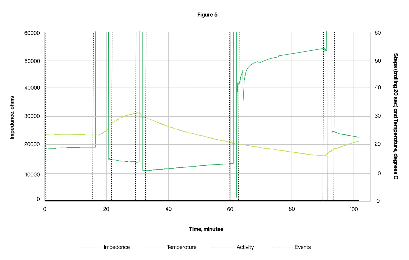 Sweat fills the reservoir, continuously travels down the flow path, and freely exits the flow path through an outlet, unlimited by time or sweat volume. As the sweat passes through, two pairs of electrodes (powered by the Nix Pod which connects pogo pins to the pin pads on the patch) each measure the ionic potential – or electrical impedance - of the sweat, capturing the naturally-occurring microfluctuations in electrolyte composition. Measuring the sweat each second in both locations – Impedance 1 and Impedance 2 – creates a time series of data in each location in the flow path (Figure 2).
