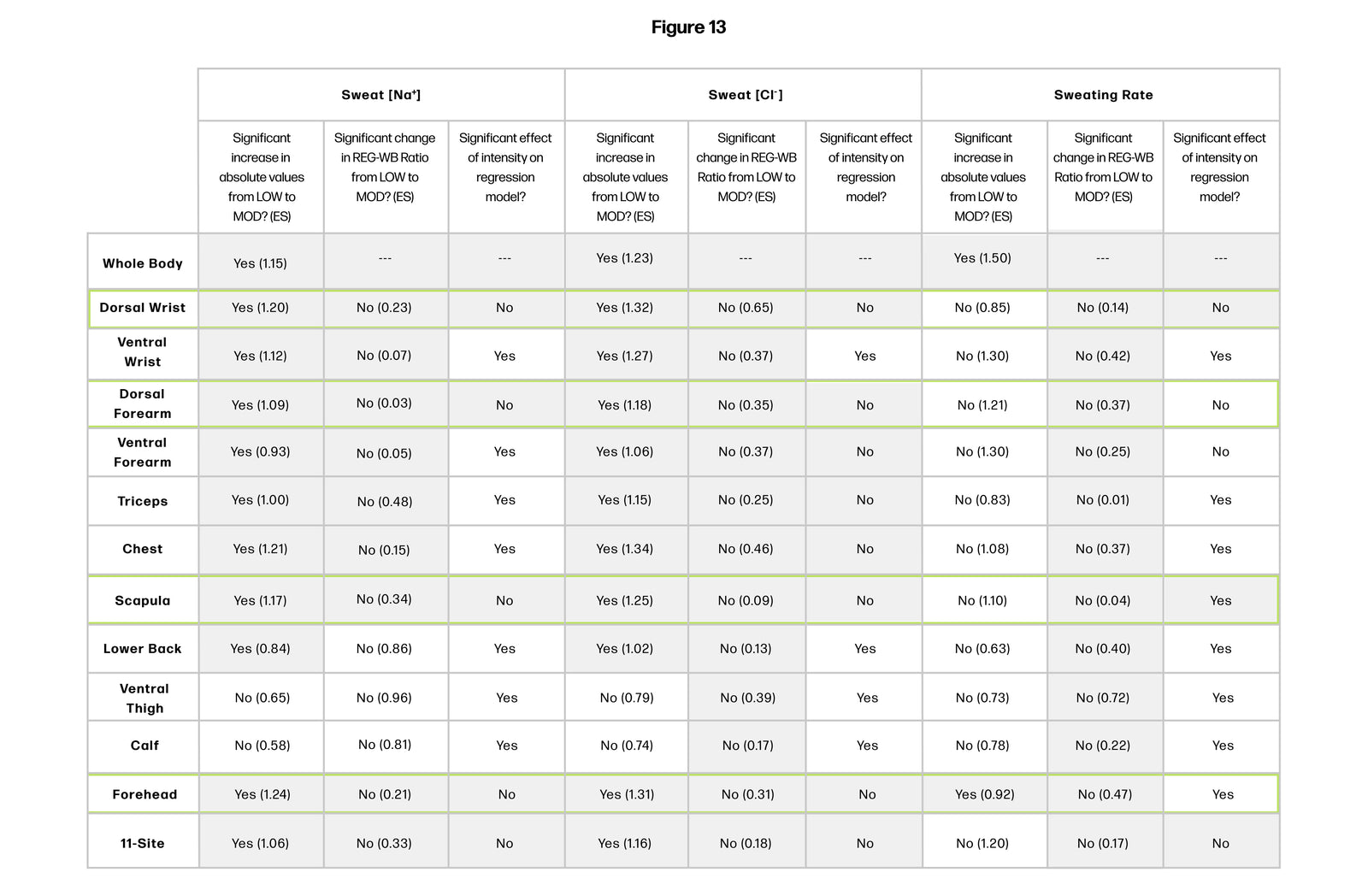 According to Dr. Baker’s analysis, the dorsal wrist, dorsal forearm, scapula, and forehead are among the most suitable anatomical sites for using regional measurements to predict whole-body sweat electrolyte concentrations (Figure 13). However, several of these are impractical for patch placement on an athlete in the field. Nix proprietary research shows reliable reproducibility of dorsal forearm and dorsal bicep sweat rates. As such, the bicep was selected as a practical and tolerable location for Nix patch placement.