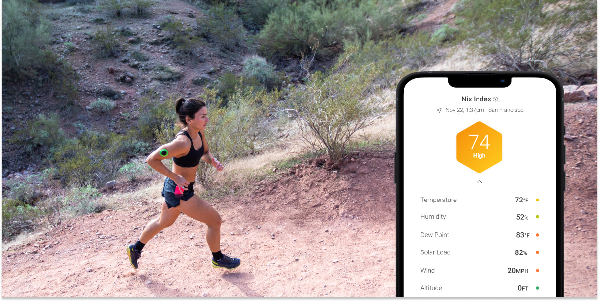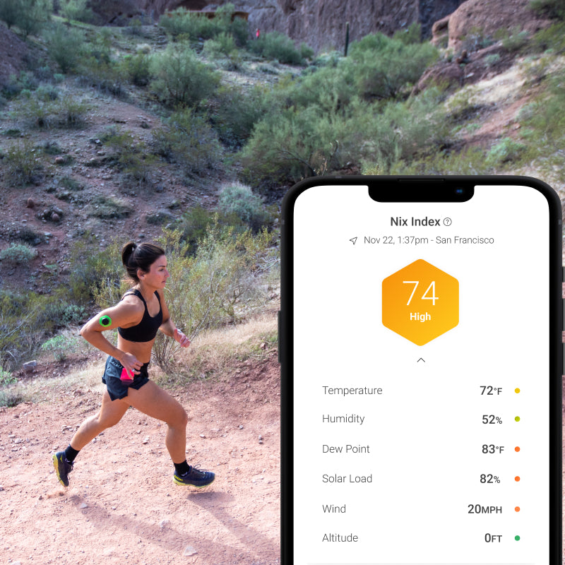 At Nix, we use it as an environmental score to help indicate how the environment will impact your sweat rate during a workout. The Nix Index is based on Relative Humidity, Wind Speed, Solar Load and Temperature, while also taking into account Dew Point and Altitude. Unlike WBGT, the Nix Index does not account for the Sun Angle. The Nix Index is also normalized to a scale of 0 to 100, whereas WBGT can go below 0 or above 100. However, because the Nix Index is normalized it is very easy to interpret. The higher the Nix Index, the more heat stress and sweat you are likely to experience during your workout.