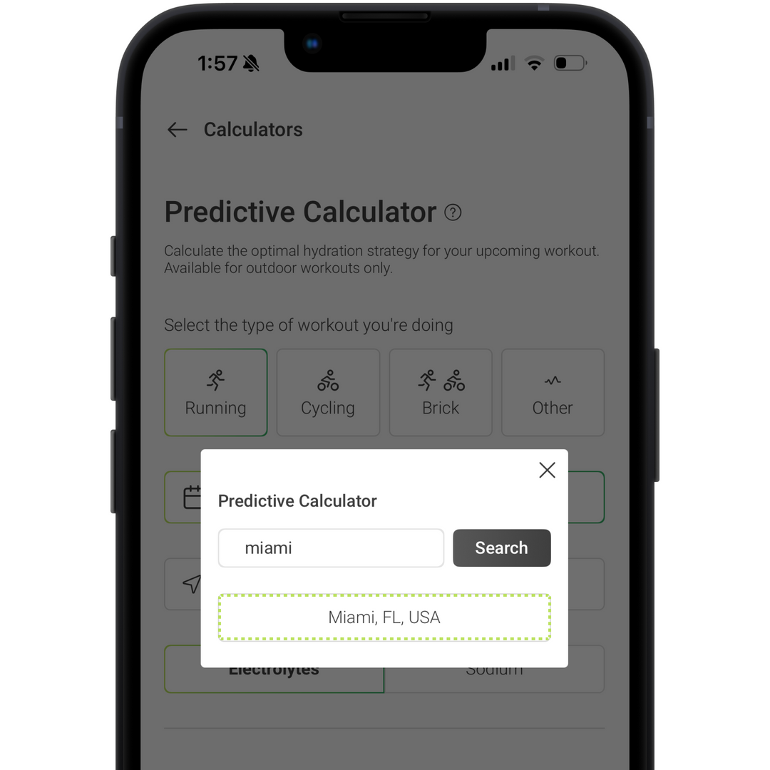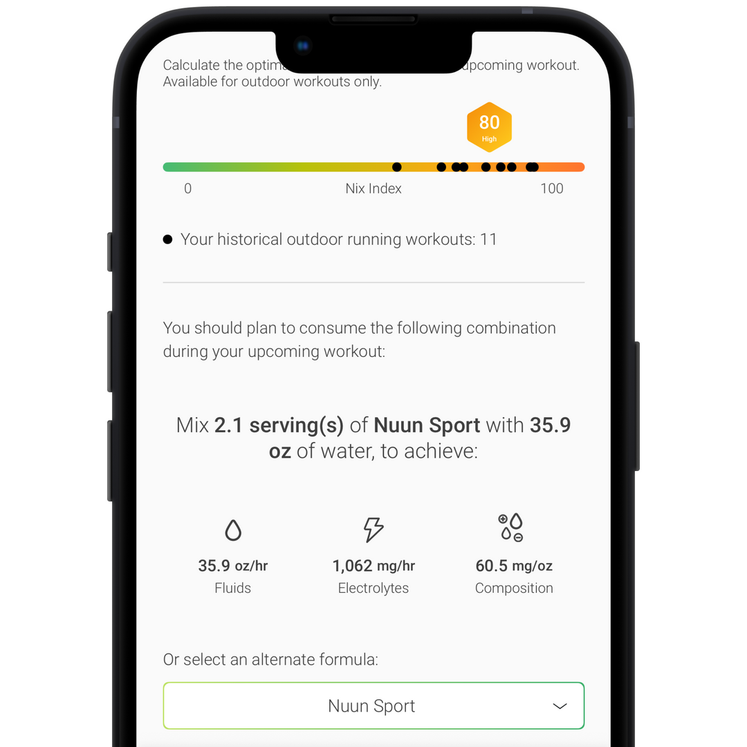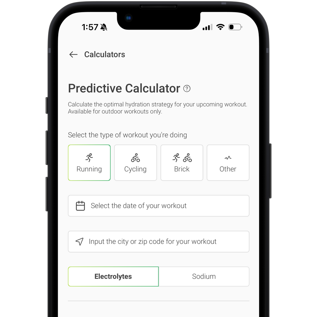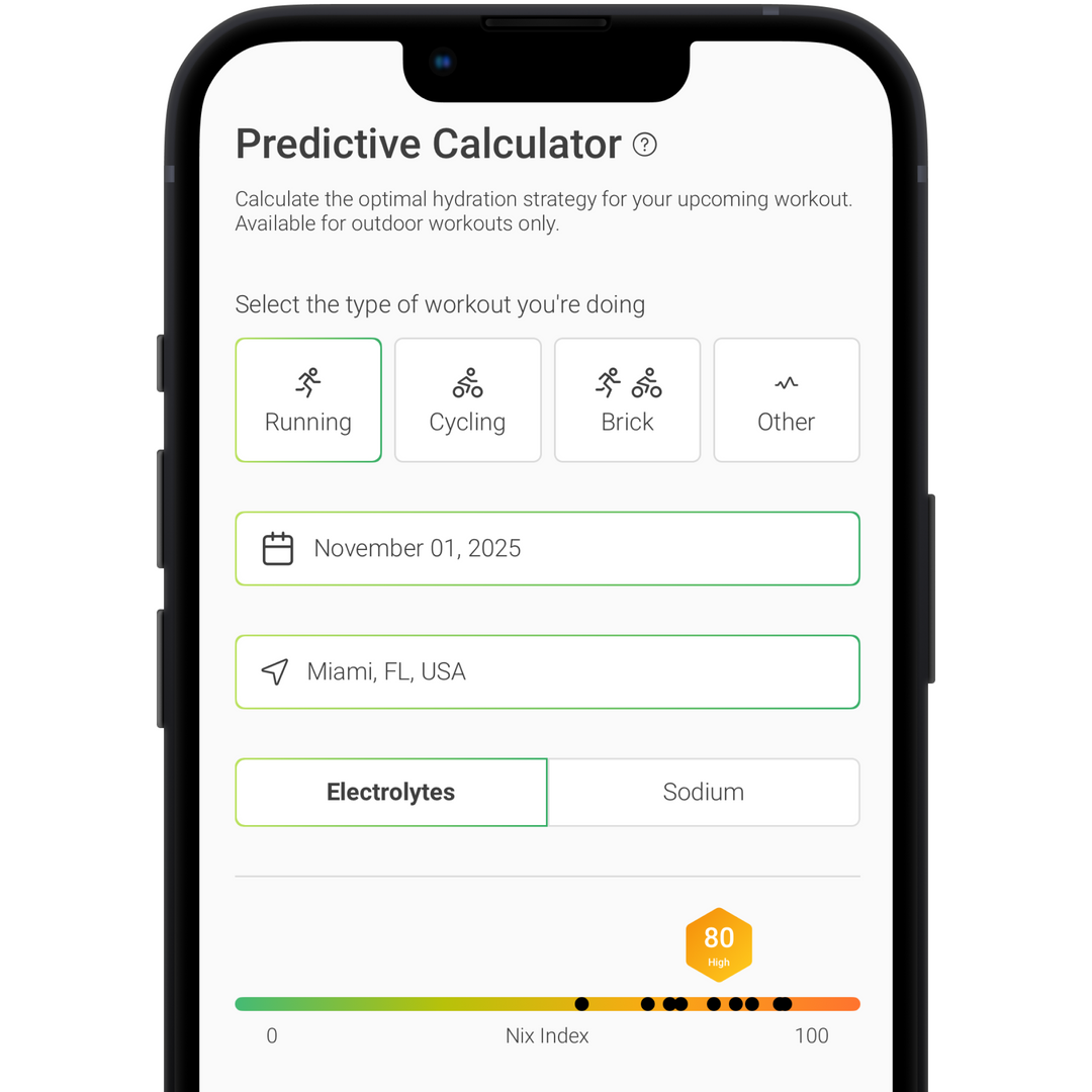 Similar to the Race Day Calculator that leverages 10 years of historic weather data combined with your personal Nix workout history, the Predictive Calculator leverages the upcoming weather forecast for your workout location and date to generate a customized hydration strategy for you.