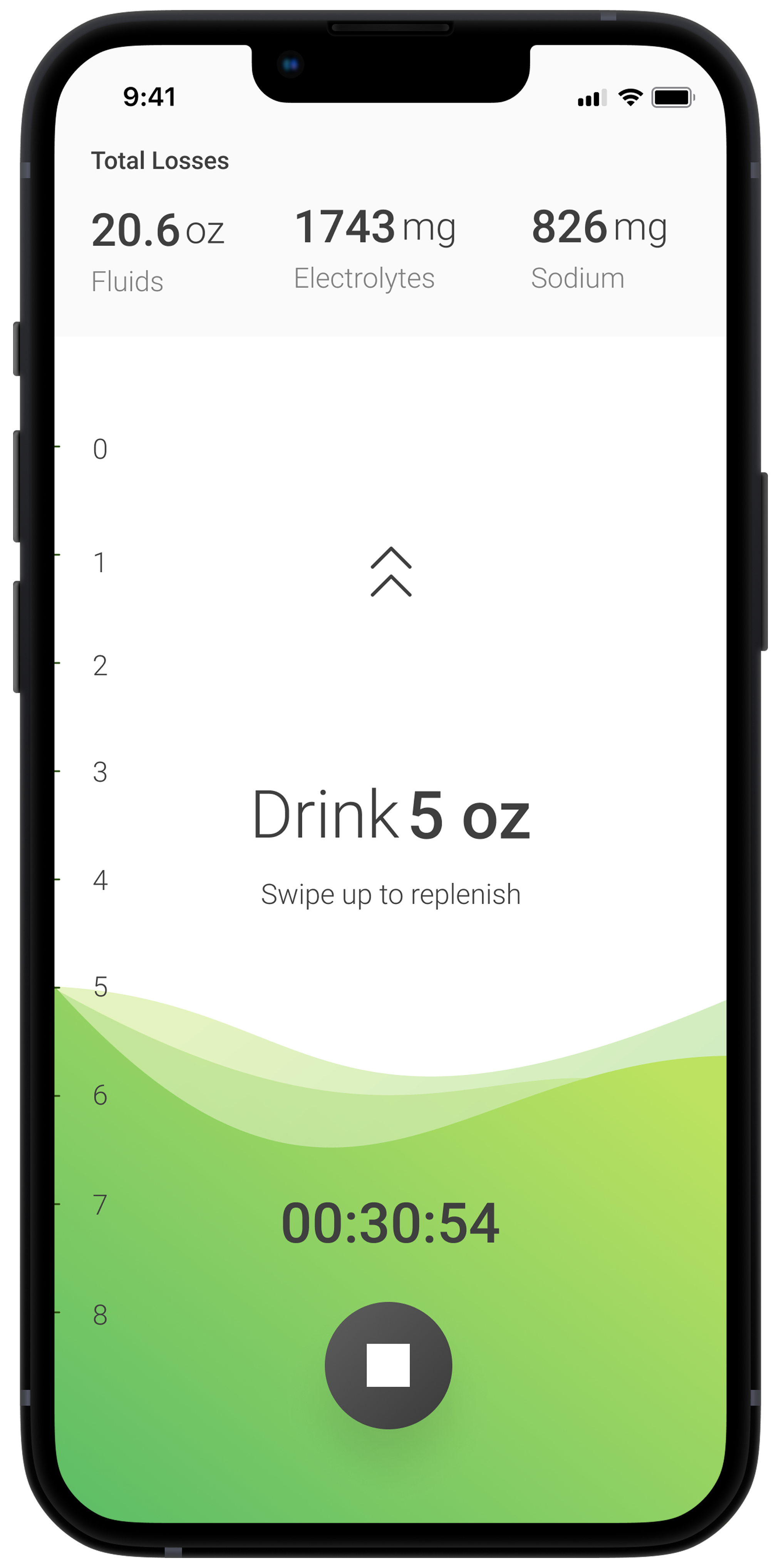 No more trial and error to identify your optimal hydration strategy. Our revolutionary hydration biosensor platform quantifies fluid and electrolyte losses moment-by-moment and sends notifications to your phone, watch, or bike computer to tell you exactly when, what and how much to drink. So you can focus on what really matters - your workout.